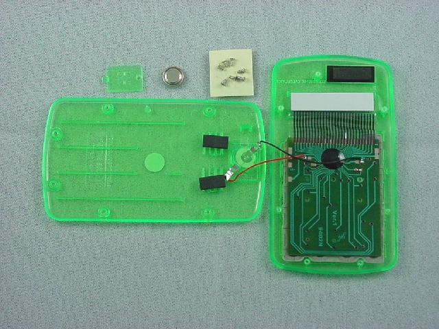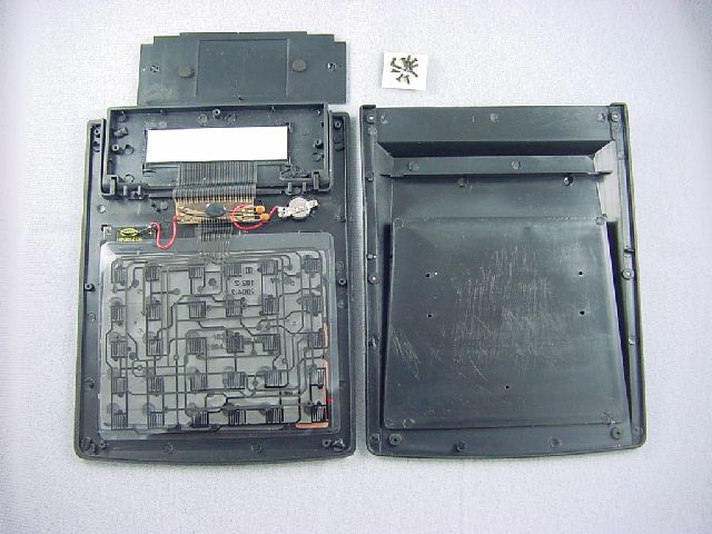 Backside of calculator, with internals visible. Note that PCB is back of the keyboard. |